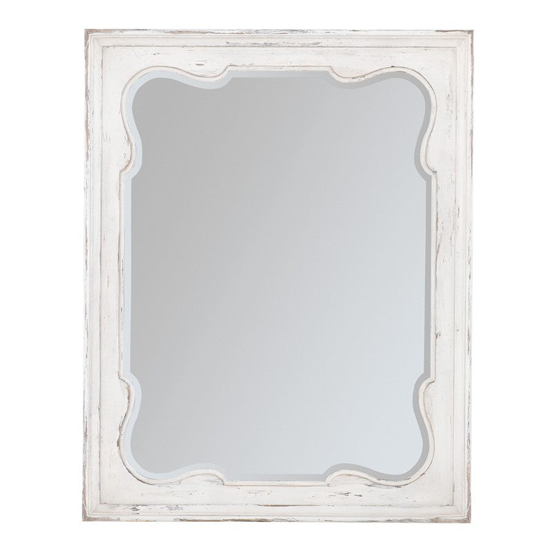 Framed with a delicate scalloped interior edge, the Americana Landscape Mirror reflects a simpler time. With beveled mirror glass, the wood frame is finished in the time-worn white Daisy, representing the natural wear one might expect of pieces passed down through the family over time revealing the rich oak character beneath.