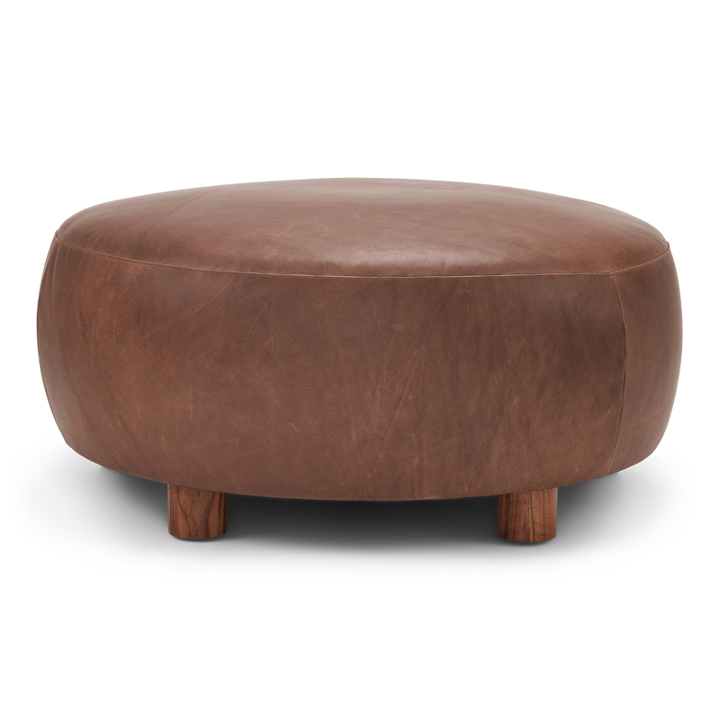 This perfectly scaled ottoman, a little sister to the Nicholas chair carries over the solid wood column leg details as well as the prominent crown and soft curved form.