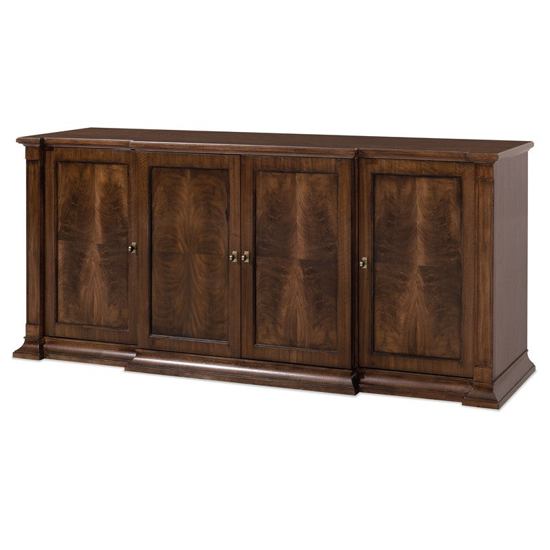 Elevate your dining room with the luxurious Archives Buffet, crafted with a rich blend of materials that evoke timeless sophistication. Featuring figured walnut veneer and walnut swirl accents, this buffet showcases a high clarity Classic Walnut finish that enhances its depth and warmth. Four spacious doors with satin brass hardware open to reveal adjustable shelving and a silverware tray, offering both style and functionality. Perfect for those who seek to blend modern elegance with historic charm, this buffet serves as an essential piece for formal dining rooms.