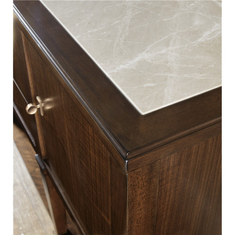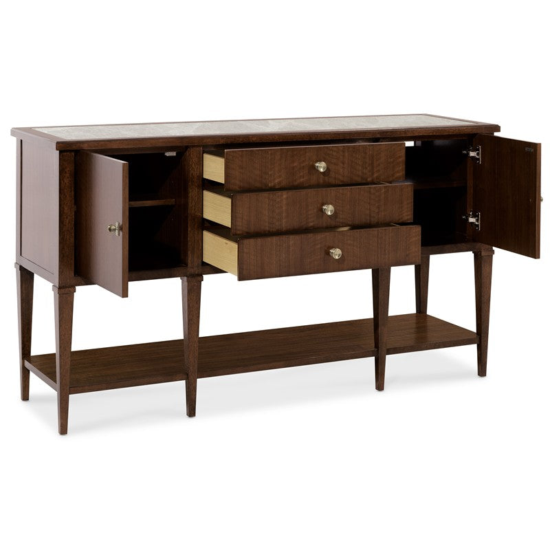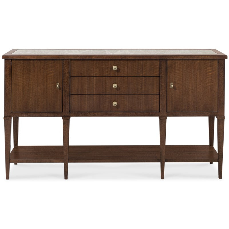 Make a sophisticated statement with the Archives Server, combining refined materials like figured walnut veneers, and a striking Castle Grey marble top. The high clarity Classic Walnut finish enhances the server’s depth and richness, while satin brass hardware adds a luxurious touch. Featuring two doors, three drawers, and an adjustable shelf, this server offers ample storage space, including a silverware tray. Perfect for the dining room, this piece offers both practical function and timeless design, ideal for those who appreciate structured elegance.