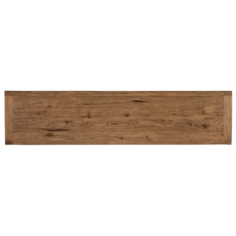 Warm and rustic with a silhouette that evokes the weight, heft and heritage of beam construction, the Big Sky Buffett is crafted of Pecky Hickory Veneers with a solid wood edged top. The buffet is finished in Vintage Natural, an organic finish that reveals the authentic knots and wood grain patterns. The four doors have soft-close hinges, and there’s one self-closing drawer and one adjustable shelf behind each pair of doors. The right side drawer has a removable felt liner and the left side drawer has a removable silverware tray. The interior is finished in Charred Timber, inspired by the restorative beauty of a fire-ravaged forest.