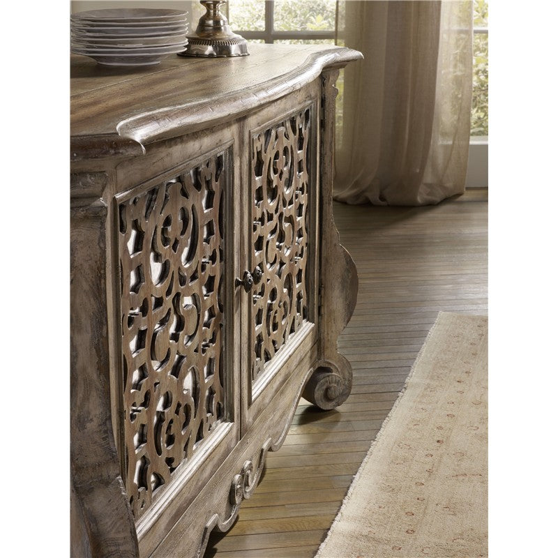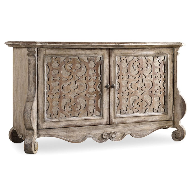 Set a buffet of livable luxury. The timeless Chatelet Buffet features two mirrored fretwork doors, a scalloped base and the soft amber Caramel Froth finish. The accent finish is Paris Vintage, a distressed white with fretwork overlay. The burnished bronze drawer pulls are inspired by antiques. One adjustable shelf.