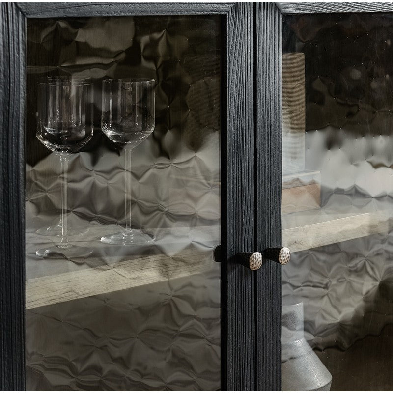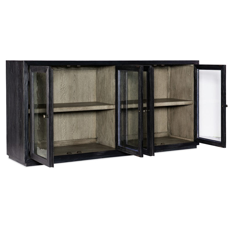 With the aura of a rustic mountain cottage, the Linville Falls Server has four wood-framed doors with seeded glass inserts and two adjustable shelves behind each pair of doors. Crafted of Pine Veneers, the Server has a charred black finish achieved through Shou Sugi Ban, a Japanese technique that creates a look resembling burnt wood. The interior is finished in Mink, a soft smoked gray. Textured metal par pulls are in an antique pewter finish.