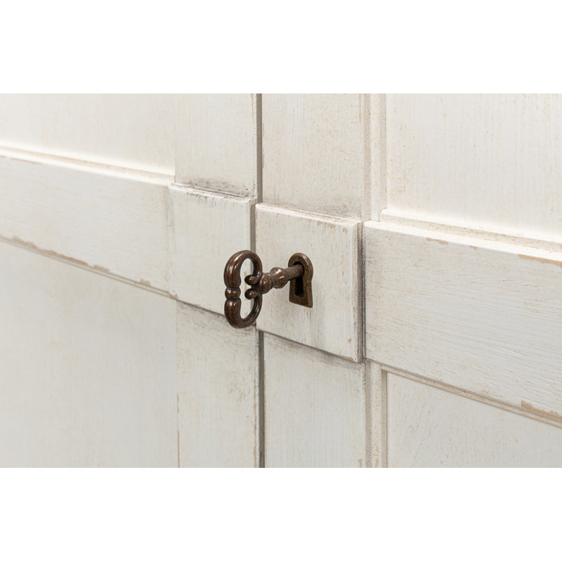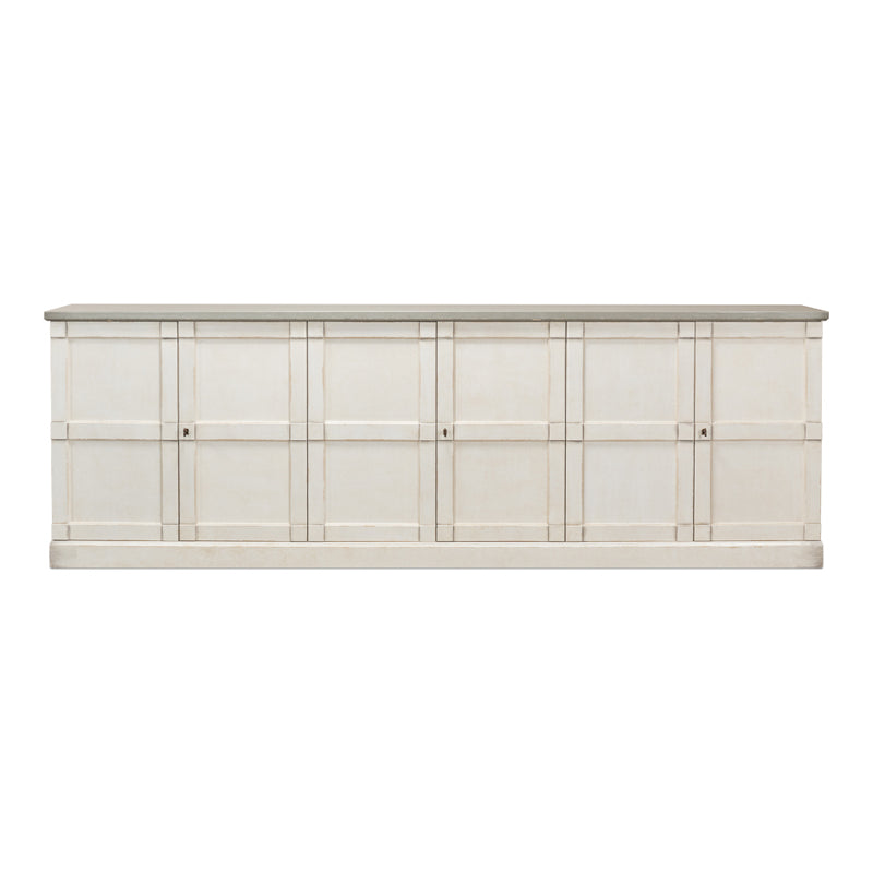A very popular buffet from Rhapsody in Colors, the "Luciana" is shown here in their Stucco White base with a Gray wood top. The six doors reveal individual compartments, each with an adjustable shelf.
