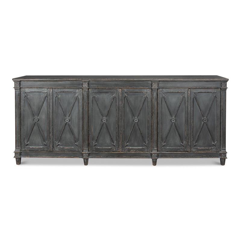 This concrete grey finish may be the most pleasing of all our Marksman cabinets. Crossed arrows on each door, raised panel detail on each side, and medallions at the top and bottom of the column-like stiles.