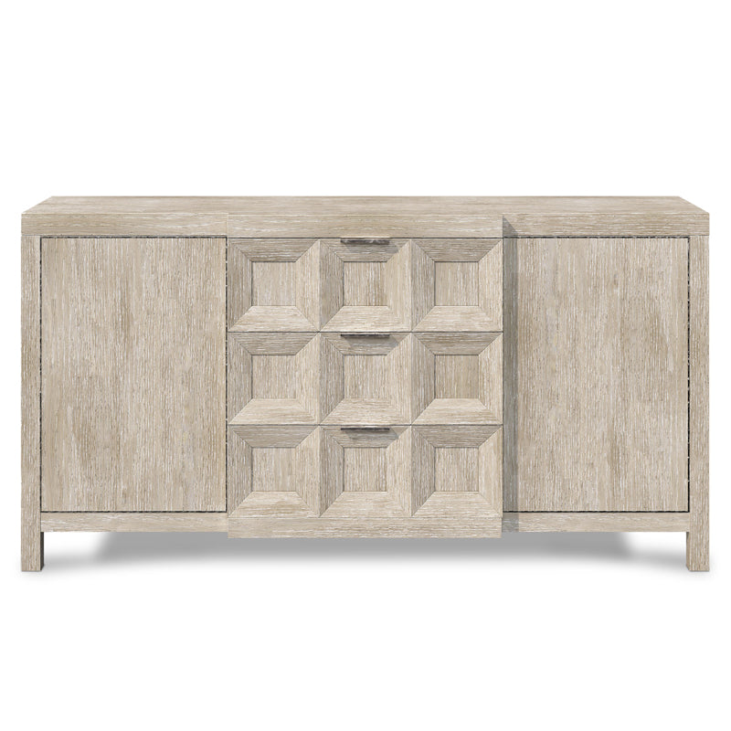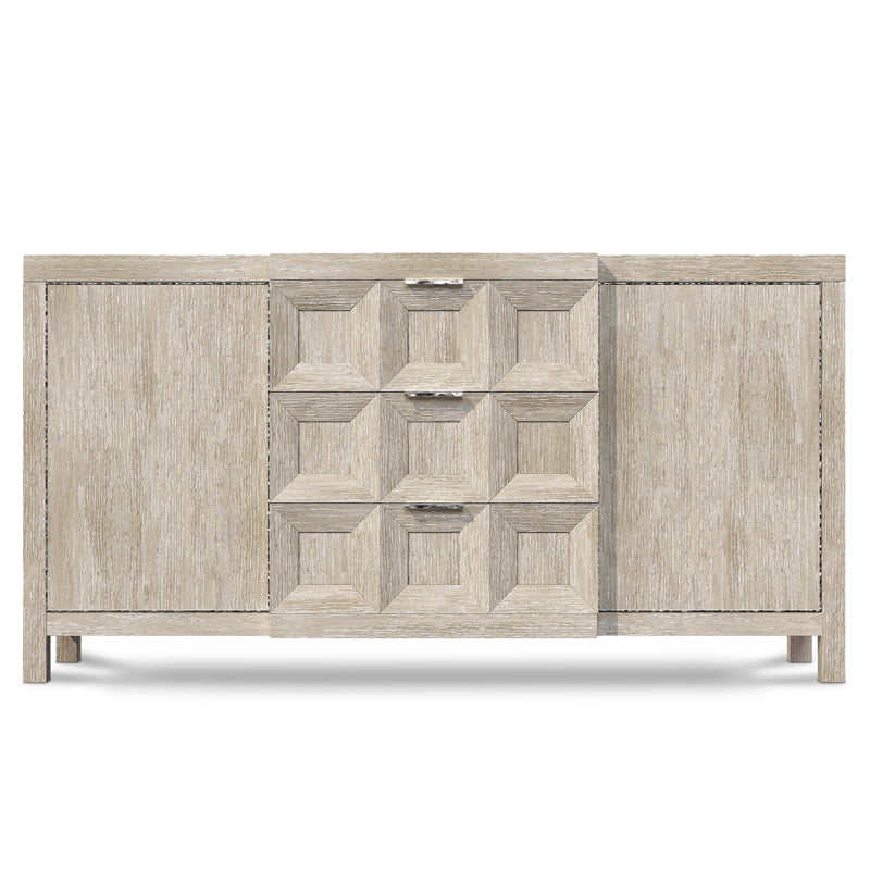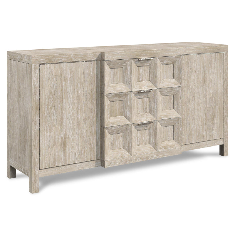 Ash solids and white oak veneers in Tawny finish with cast resin coffered design on center drawers and inset metal frame in Bright Graphite finish around doors