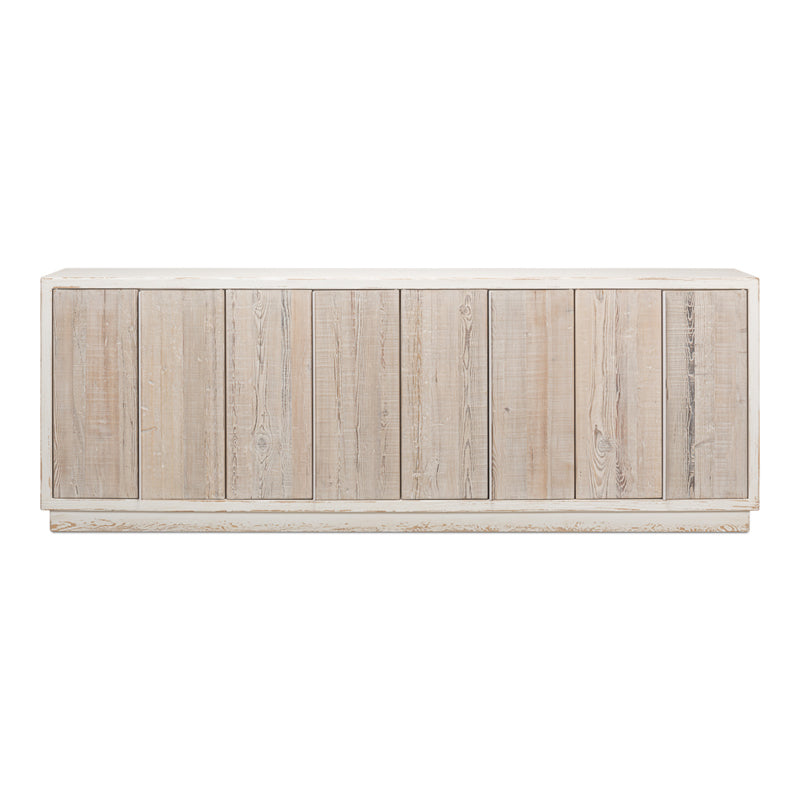 Reclaimed solid pine constructed with tongue and groove joinery by cabinetmakers. Antique white finish with natural aged pine finish on the doors. White metal vertical strips open doors.