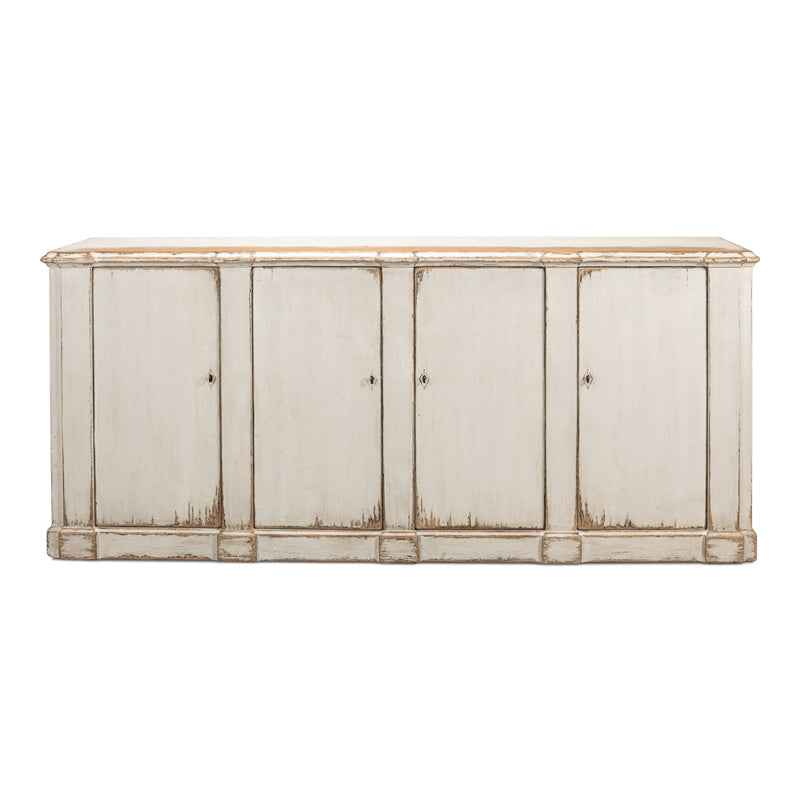 A new Sarreid sideboard, the Villefranche has considerable distressing that is very well done. A small clip to the corners of the top. A plinth-like element at the base of each stile.