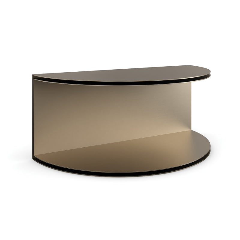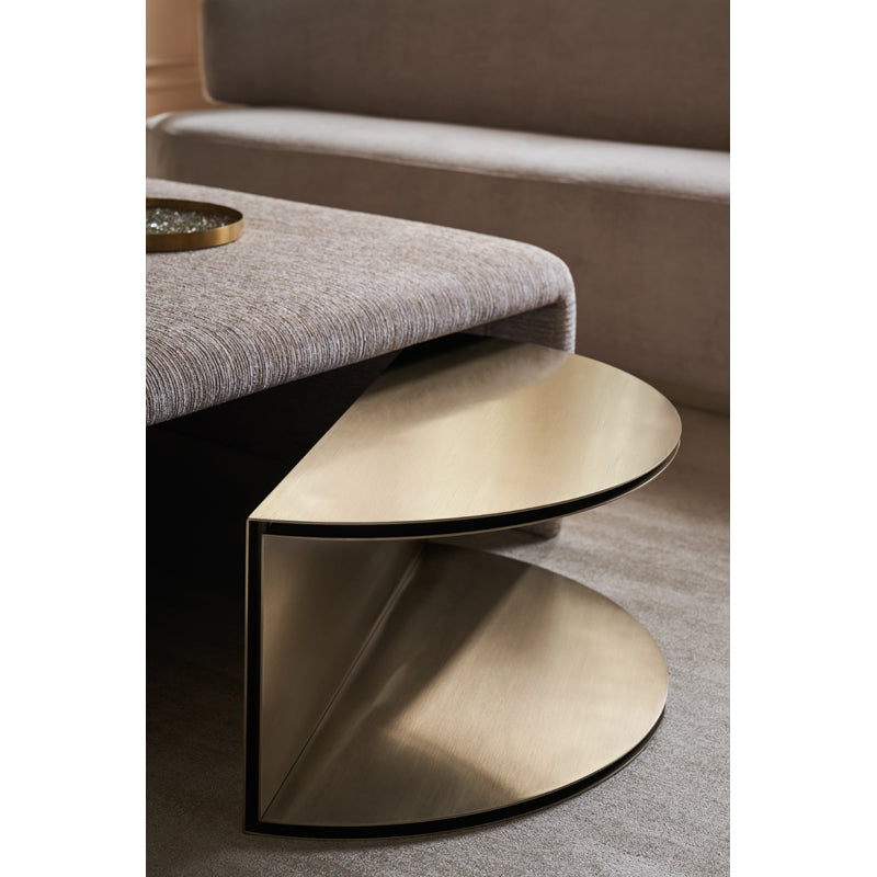 The elegance of geometry was inspiration for this dually functional table, composed of two demilune shapes that come together and form a perfect circle. Introduces an industrial yet luxurious aesthetic in a Champagne Gold finish, designed with a double wall of bent metal to create a cantilevered upper and lower shelf. Tuck beneath our Bridge the Gap table for a unique cocktail table that melds sleek metallic curves with a tactile form in a soft rib cloth fabric with a blush gold tone. Or, pull apart to style as individual end tables.