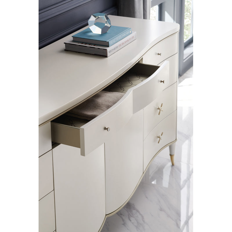 A reigning beauty in any room, this dresser attracts attention in a mix of pearlescent finishes and sparkling metallics. Encased in Stardust, its gracefully curved form is accentuated by Platinum-striped beading along the top and bottom. Features nine drawers and adjustable shelves behind two center doors, with ample space for neatly keeping clothes and jewelry. Surprise moments: a top center drawer adorned with a silkscreen pattern, and two outer drawers lined in our classic Caracole Crème felt. Splayed legs dressed in gold metal ferrules and ornate drawer pulls with a ceramic inset add to its splendor.
