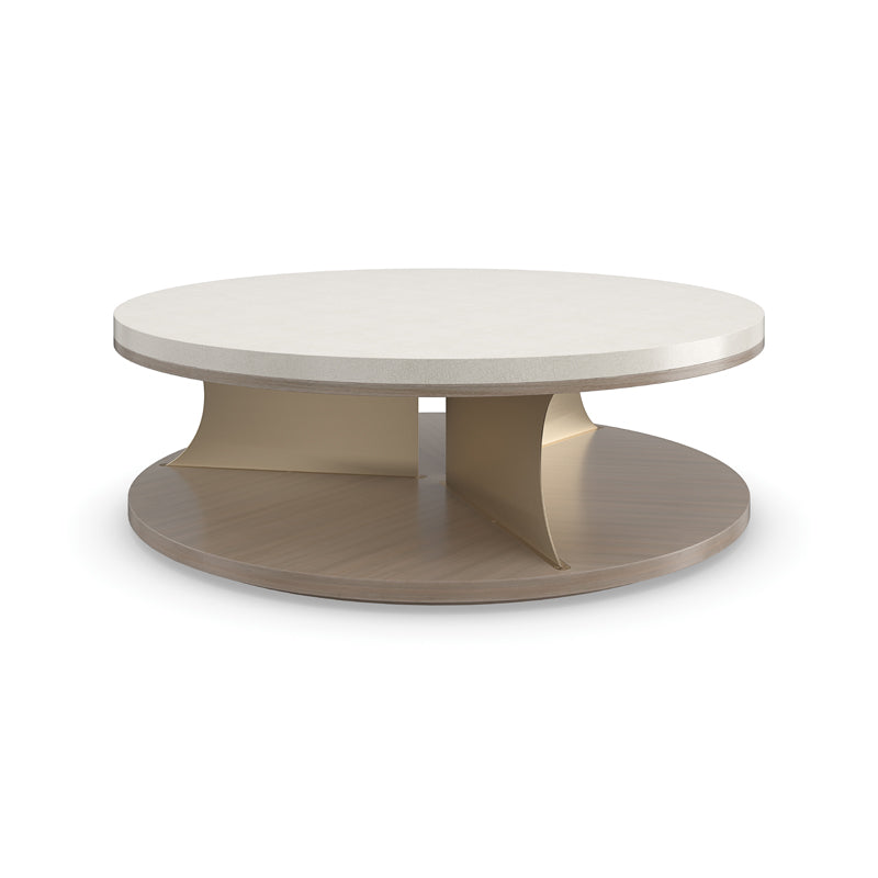 Understated yet elegant, this artful cocktail table is a celebration of materiality and simple form. Features an ample top in an Ivory Craze crackle finish, supported by a trio of Brushed Gold metal blades, perfectly distributed to create open space for storage and display. A swiveling plinth base adds intrigue and function.
