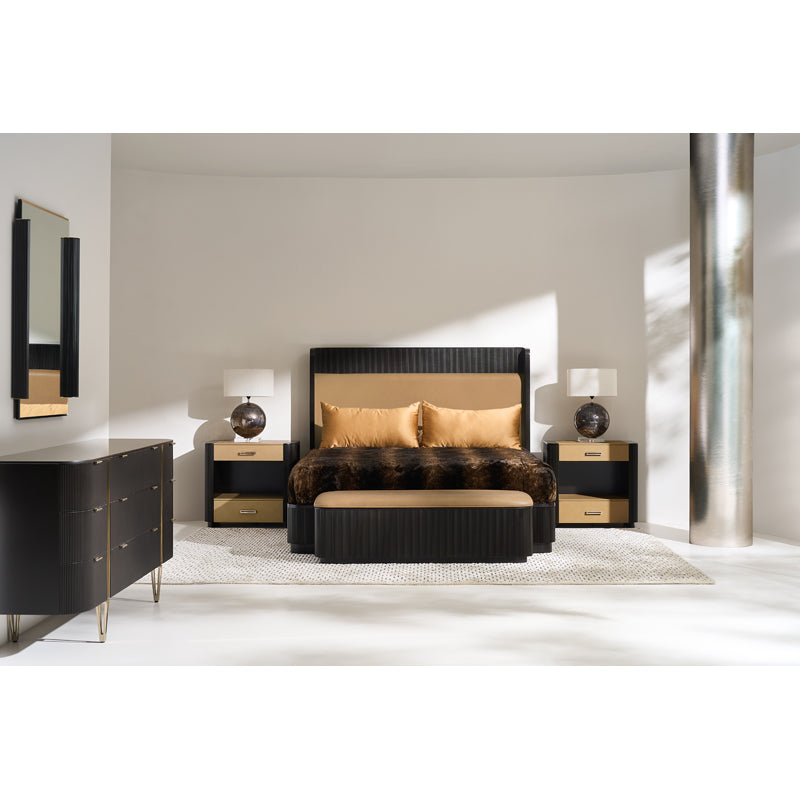 “Fall in Love” is even more captivating with this beguiling interpretation of our softly curved platform bed. A thoughtful combination of luxe materials, reeded the headboard, footboard, side rails and plinth base are sultry Dark Chocolate. The headboard is upholstered with an inset of rich Camel pebbled leather. Whisper of Gold metal trim adds an appropriate touch of glamour. Understated yet exceptional, this beloved bed captures the essence of everyday elegance.