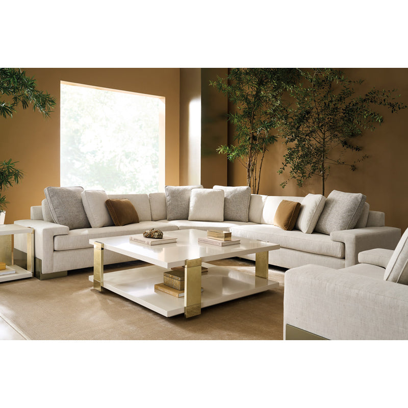This square coffee table presents a beautiful balance of linear forms and light. Its Almond Milk tabletop and shelf appear to float within Oracle hand-applied leaf wood posts. Whisper of Gold metal accents trim the top and bottom of each post, adding a dressed up touch to this piece.