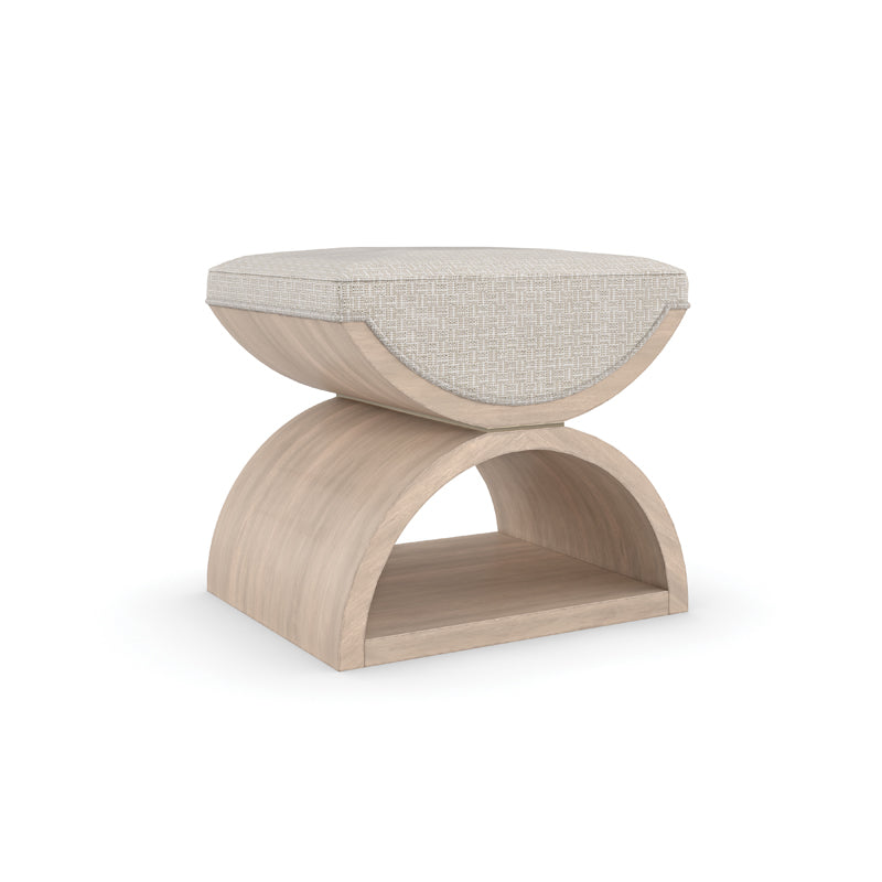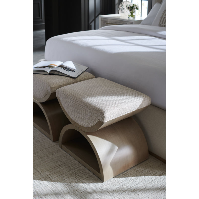 Inspired by a neoclassical design, this double, u-shaped ottoman lends a modern take on the Curule bench, dating back to royal courts of ancient Rome. Versatile and visually alluring, it functions as a seat or ottoman, and when styled in pairs at the end of the bed, makes a luxe landing for getting dressed. Exquisitely tailored in a woven geometric fabric with lustrous accent threads, a plush upholstered seat rests atop its sculptural wood frame—with two crescent shapes separated by a thin band of Majestic Gold and finished in a tonal beige with soft gray undertones.
