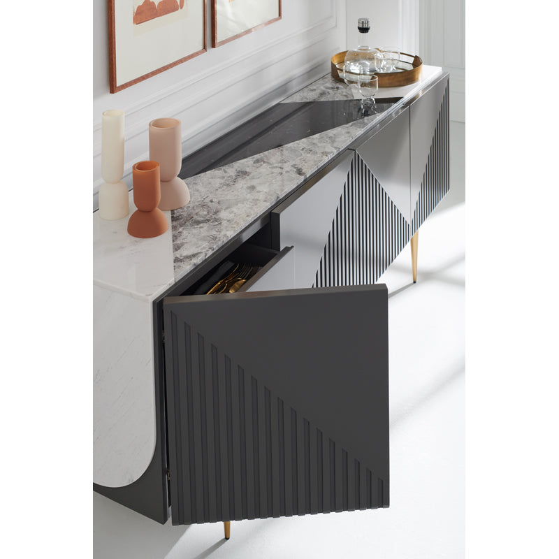 Bring a modern form to traditional dining with our Over the Edge buffet, finished in Warm Slate and a mix of polished marble and stone. Graphic slat details add dimension to this contemporary design, balanced on tapered metal legs in Champagne Gold. Perfect for happy hours and hosting, it offers generous storage with two drawers, adjustable shelves and open space, neatly concealed by touch-latch doors. Or, style as a statement-making console in living rooms, halls, and entryways.