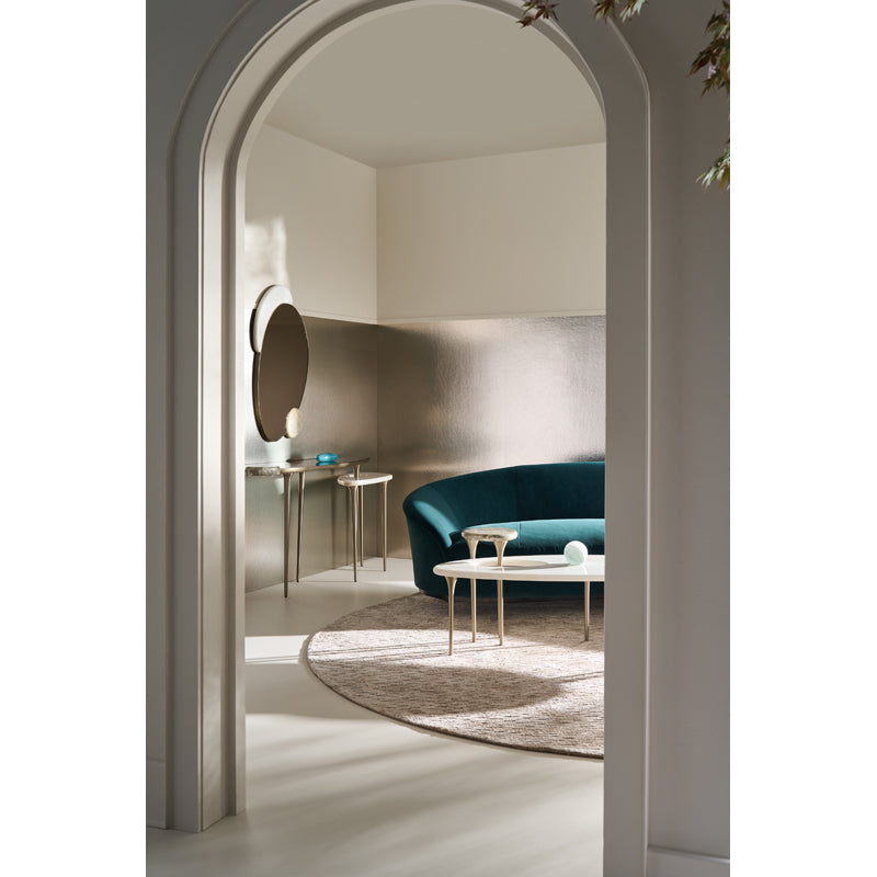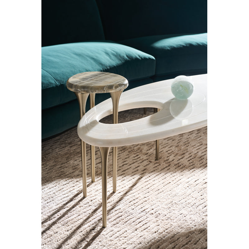 The Resonance Cocktail Table is inspired by the “Butterfly Effect” in which a small event creates far-reaching effects. This contemporary statement piece features a White marble top, with accent swirls that ripple out from a smaller, offset, elevated Grey Onyx oval marble top to a raised half-moon-shaped Grey Onyx section. Each piece is supported by a metal frame and tapered legs in shimmering Champagne Gold. For the modern collector, this piece is out of this world.