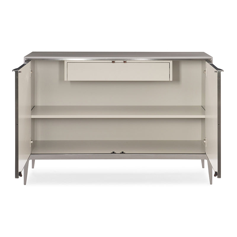 A stellar example of nature’s beauty, the Rock Steady cabinet adds modern character to any space. Wrapped in a metal frame highlighted with a Brushed Nickel finish, its two glass doors feature a one-of-a-kind painted agate pattern in a color palette of cool whites and grays punctuated by earthy shades of terracotta. Subtle finger pulls add function without taking away from the stunning brilliance of its design. Inside, you’ll find a storage area fully finished in Putty with an adjustable shelf and storage drawer. Tapered legs complete the look of this fashionable statement piece.