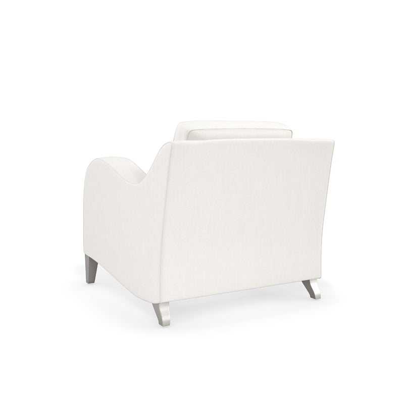 This shapely chair adds a note of effortless glamour in a cream performance basketweave with a subtle luster. Gently sloping arms lend a contemporary take on the classic English arm for a look that’s fresh, yet familiar. Tapered legs in a Sparkling Argent finish add to its shimmer. Sofa and sectional also available.