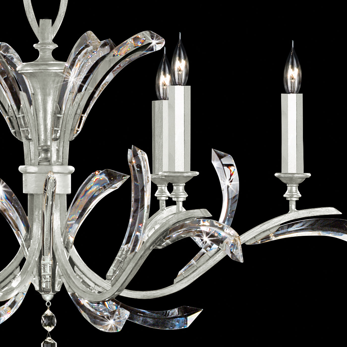 Chandelier in a silver leaf finish with matching candlesticks, featuring beveled crystal accents.