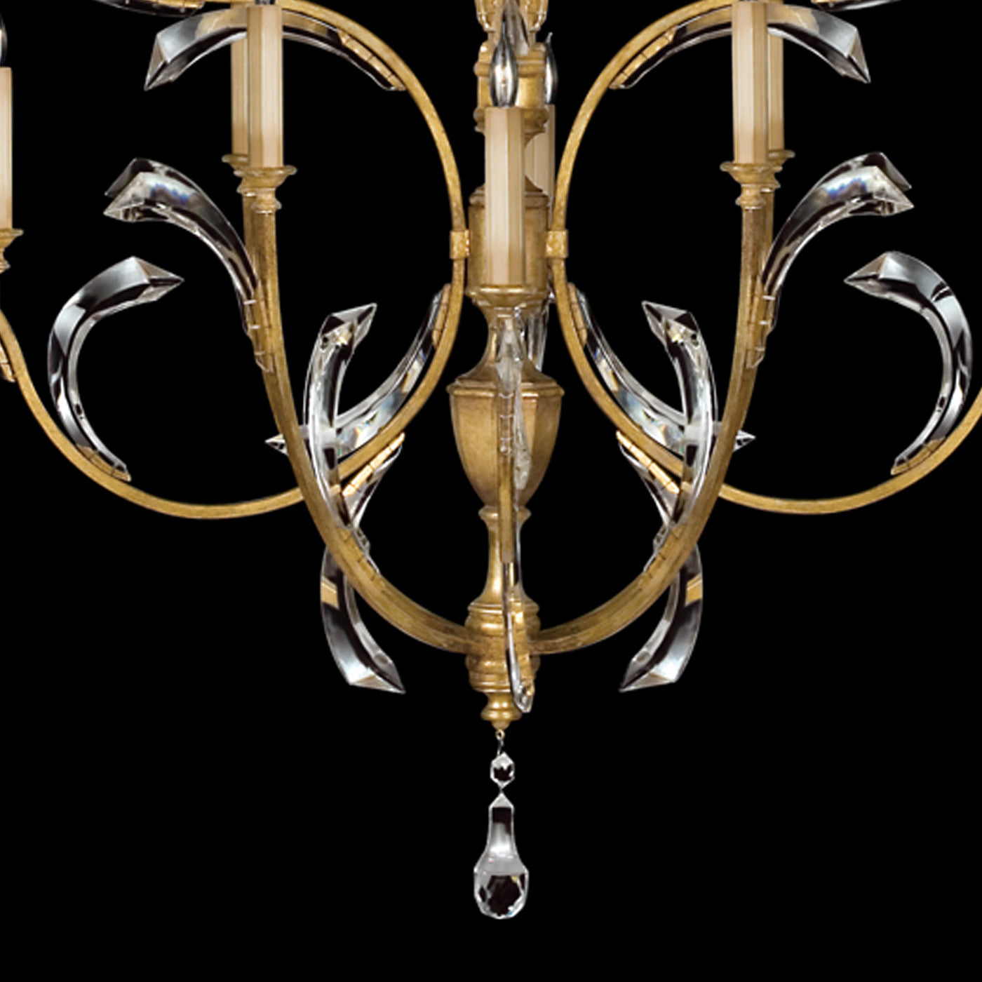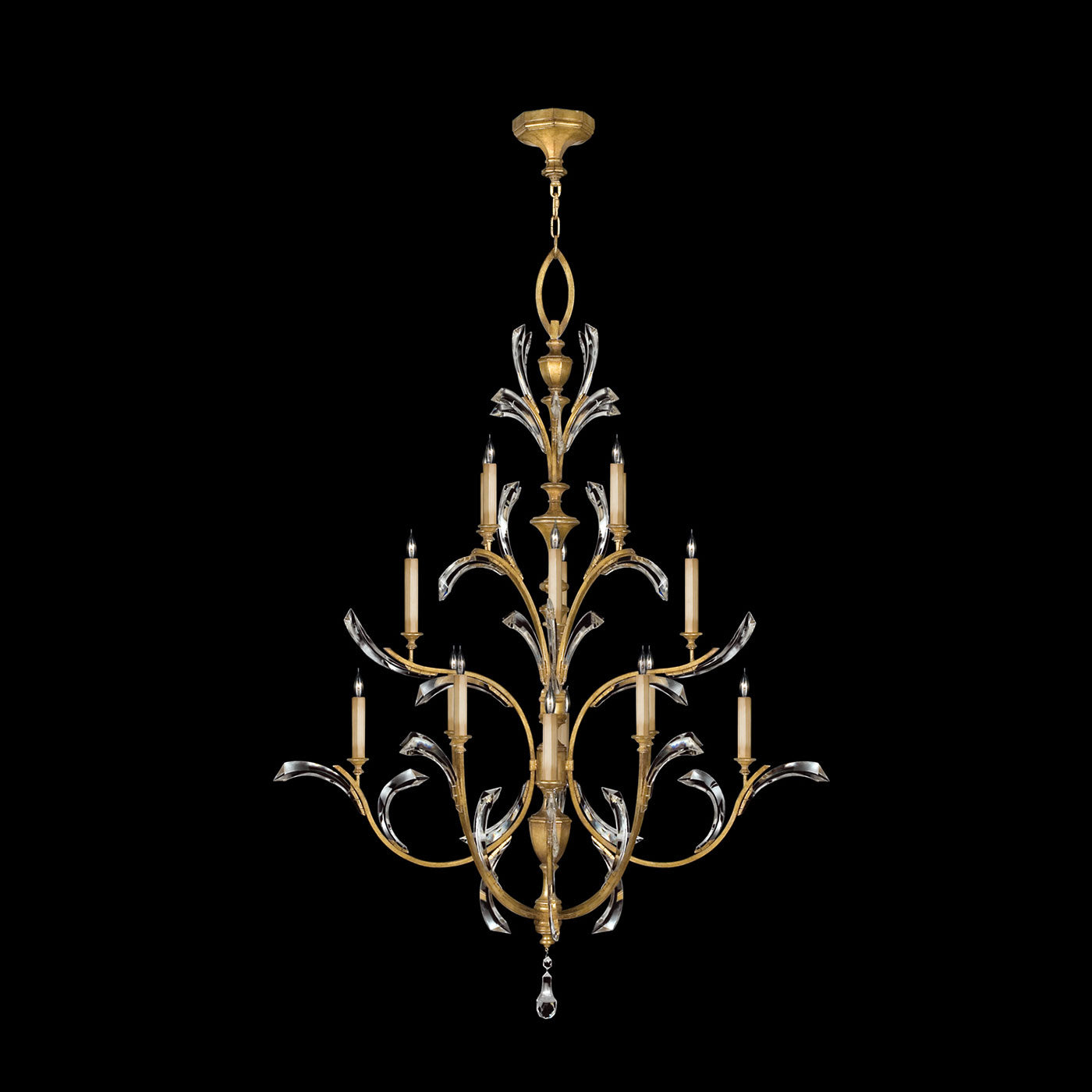 Chandelier in a warm muted gold leaf finish featuring beveled crystal accents.