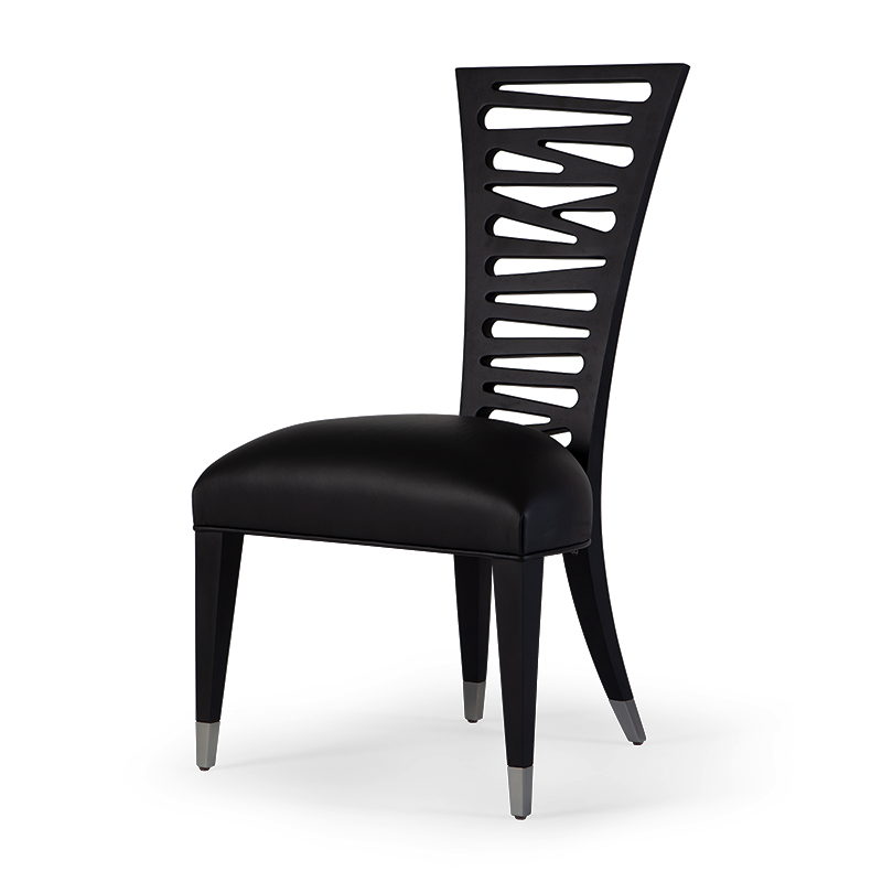 Exquisite slatted backrest chair with metal finish tipped legs featuring a sleek slimline silhouette.