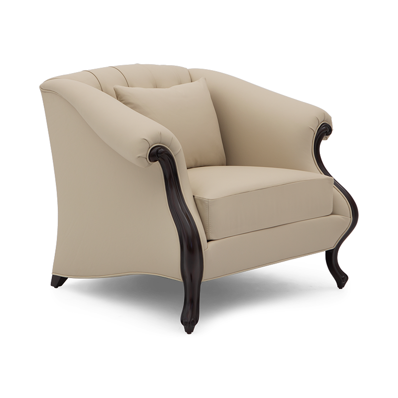 Beautifully proportioned club chair, with deep backed upholstery and elegantly curving hand-carved arms for a versatile, timeless piece.