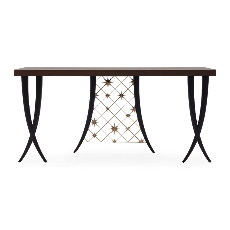 The unique Chris-Cross signature legs are central to the design of this magnificent hand-carved console table, crafted from solid and veneered mahogany, with gilded metal mesh accents.
