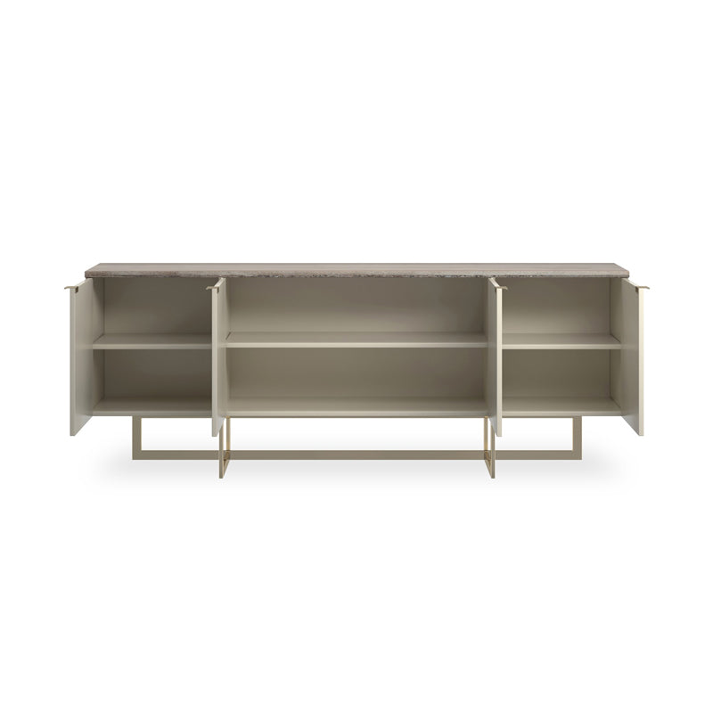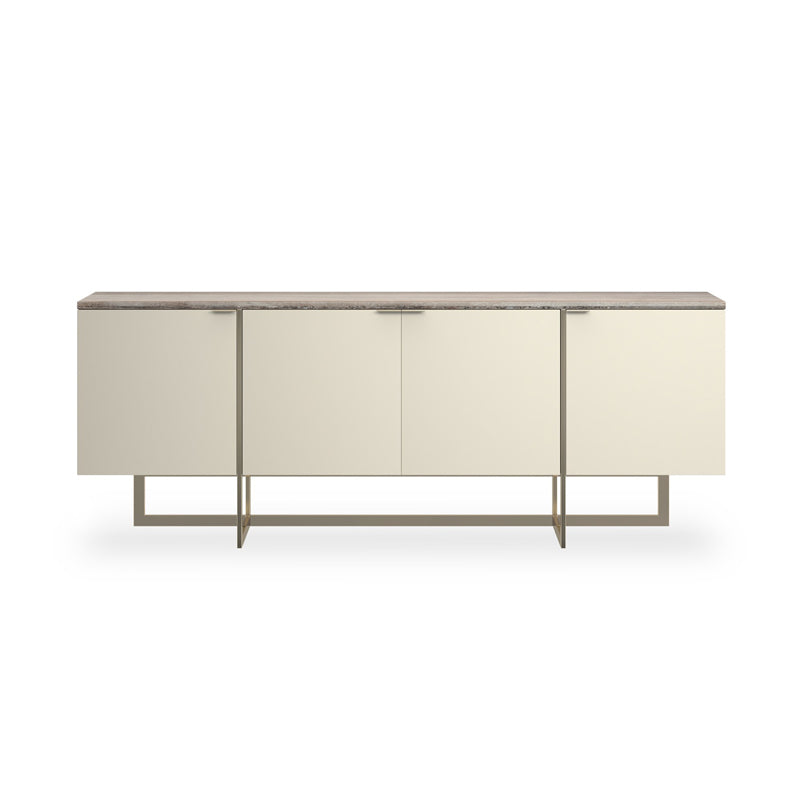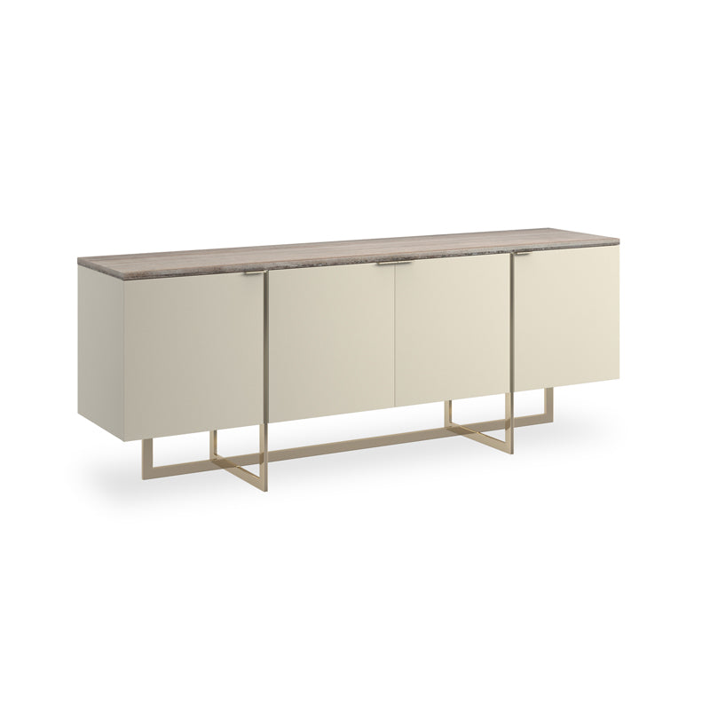 Stone, mirror-polished metal and hardwoods crisscross in this sleek media cabinet with linear appeal. Flowing Sandstone graces the 84” top of the Pearl-painted cabinet and four doors. The paint gives off just enough luster to make the piece intriguing. The doors have slim Whisper of Gold pulls. Adjustable shelving and wire access graces the inside of the cabinet. The base is the real stunner of the piece with thin intersecting bars in mirror-polished Whisper of gold that overlap each other and extend up the cabinet to add interest.