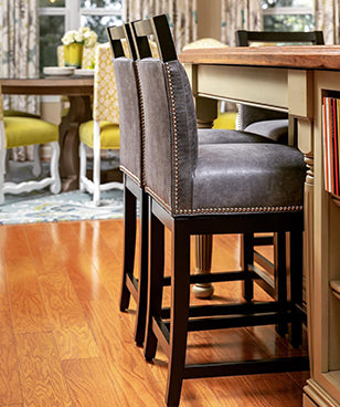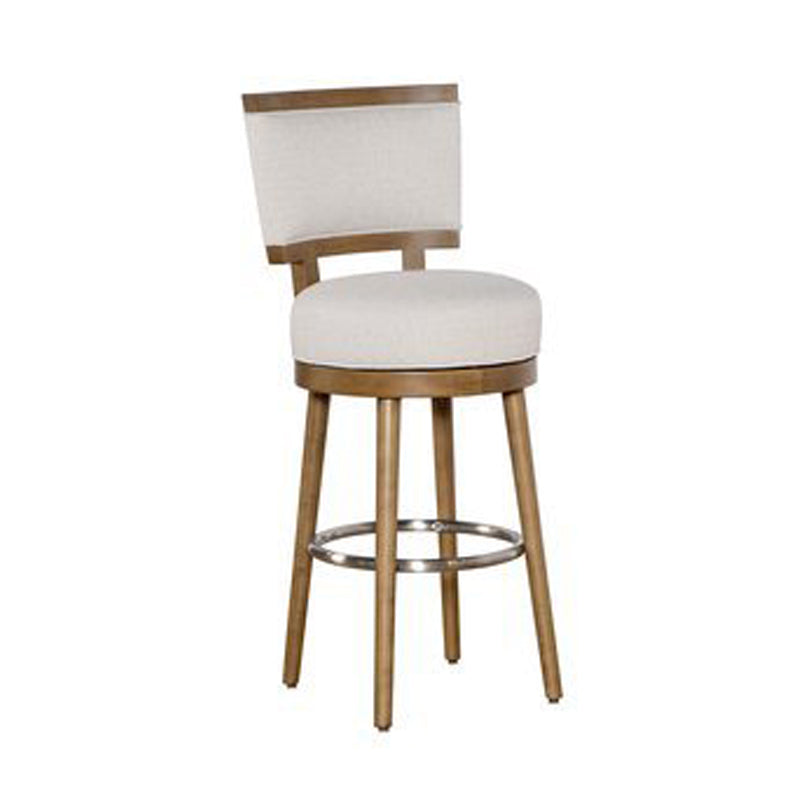 The Bartlett swivel dining stool is the matching stool to our Bartlett dining chair. Like the chair, this stool is transitional in style and features beautiful duel parallel exposed wood back rails that are curved. The wood rails frame inset upholstery on both the inside and outside back. The back is open between the bottom wood rail and the seat. Vertical wood back posts attach to the back of the tightly upholstered round seat. The seat part attaches to the round, exposed wood base by memory swivel. The rounded top rails of the exposed wood base have beaded edge work on both the top and the bottom. Round legs flow gracefully to the floor. A metal foot ring, available in three finish choices, completes this exquisite stool.
