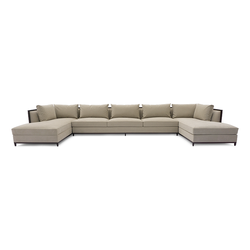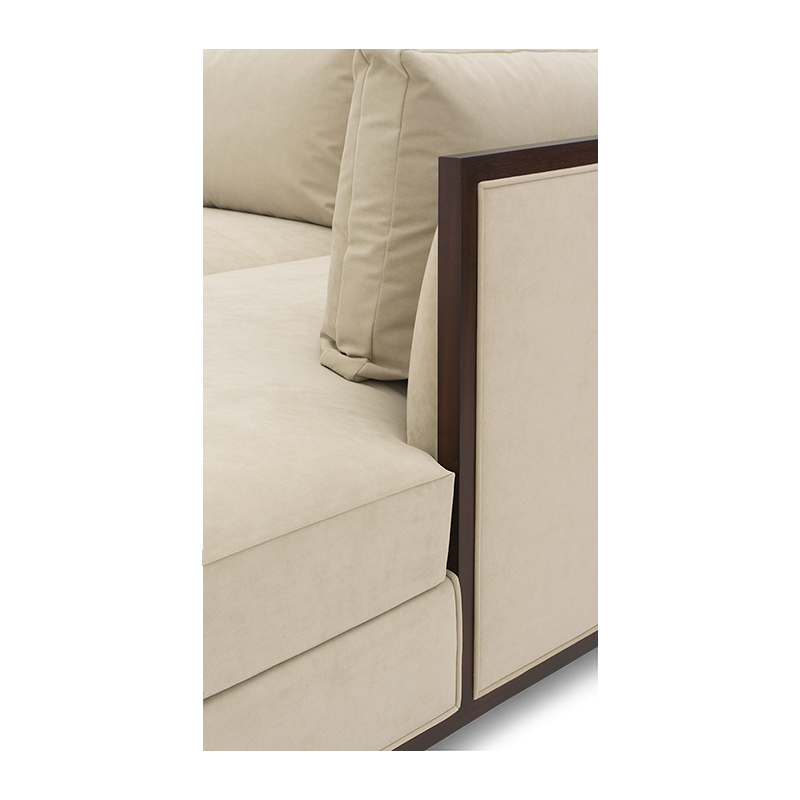 Doweled mortise and tenon frame in solid Mahogany from certified source. Hand-Carved details. Feathered down throw pillows mixed with Poly Fiber for added support. Eight-way hand tied spring base, with pocket coil seat cushions encased in high-resilient fill and feathered down jacket. Available in a selection of finishes. Sectional knockdown for spaces with limited access.