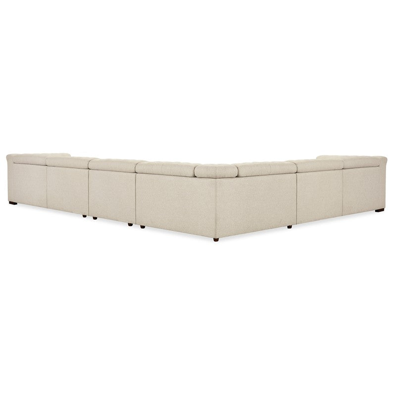 Upholstered in soft Aries Beach fabric, the Savion Deux 6 Seat Sectional offers four power recliners and seven power headrests, delivering a perfect combination of style and functionality. The smooth, durable fabric is complemented by dark wood accents, chesterfield tufting, and copper-toned nail trim. With its seamless power reclining feature, this sectional offers both luxury and practicality for modern living rooms.