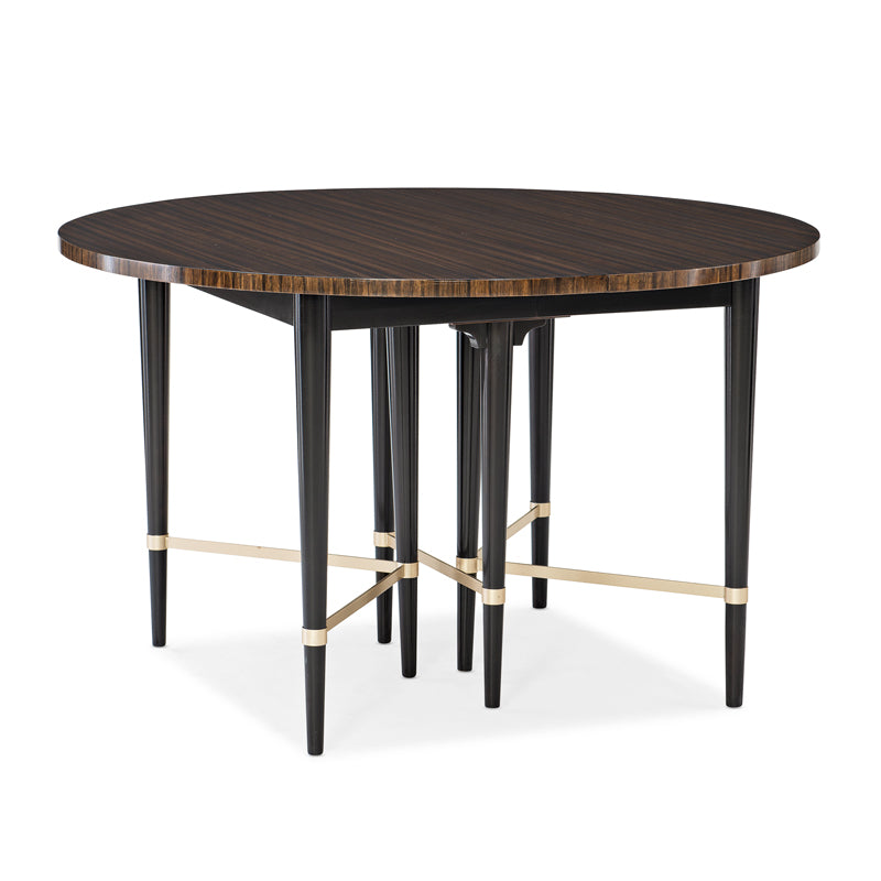 Set a stylish scene with the bold character of this statement-making dining table. Its perfect proportions offer urban scaling in a contemporized traditional design. Stunning quartered Paldao wood distinguishes the tabletop and is finished in a rich shade of Saddle. A deep Black Saddle finish adds depth to its legs and apron while a Neutral Metallic highlights the stretchers. Its 48-inch design is easily extended to 72 inches with its 24-inch leaf so you can accommodate even more guests.