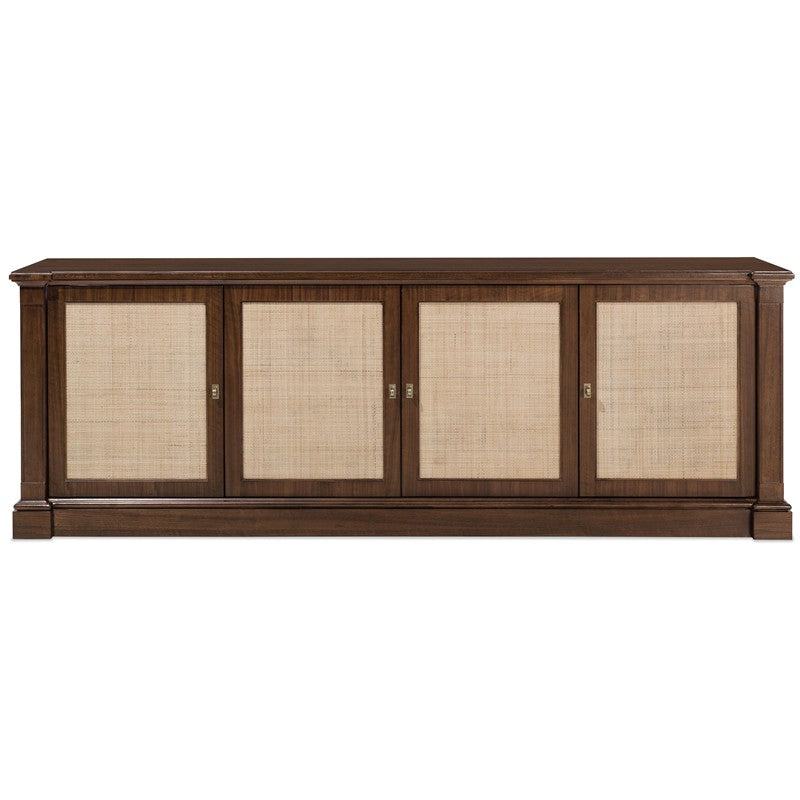 The Archives Entertainment Console brings a sophisticated blend of materials and finishes to your home entertainment space. Featuring four woven-cane panel doors and adjustable shelving, this console is designed to accommodate an 80" flat-screen TV, offering style and functionality. The high-clarity Classic Walnut finish over walnut veneers adds warmth and richness, while the ventilated back panel ensures your electronics stay cool. Ideal for those seeking a luxurious, yet practical piece to enhance their living room.