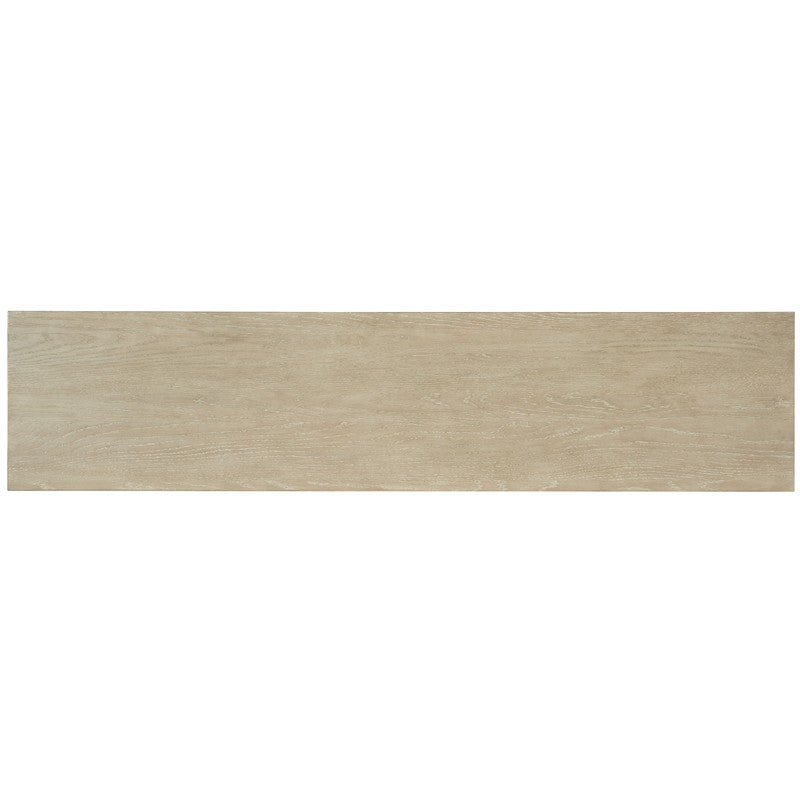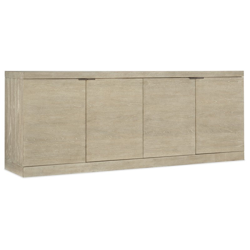 Serene and simple with a soothing neutral color palette, the TV-ready Cascade Credenza helps you create a place of retreat in your home where you can slow down and relax. The credenza is finished in Terrain, a soft taupe finish on Oak veneers with dry brushing and accented by champagne-colored tab pull hardware. Four doors with soft-close hinges and one adjustable shelf behind each pair of doors. There’s a ventilated back panel with one power supply and levelers. Accommodates up to a 75-inch TV.