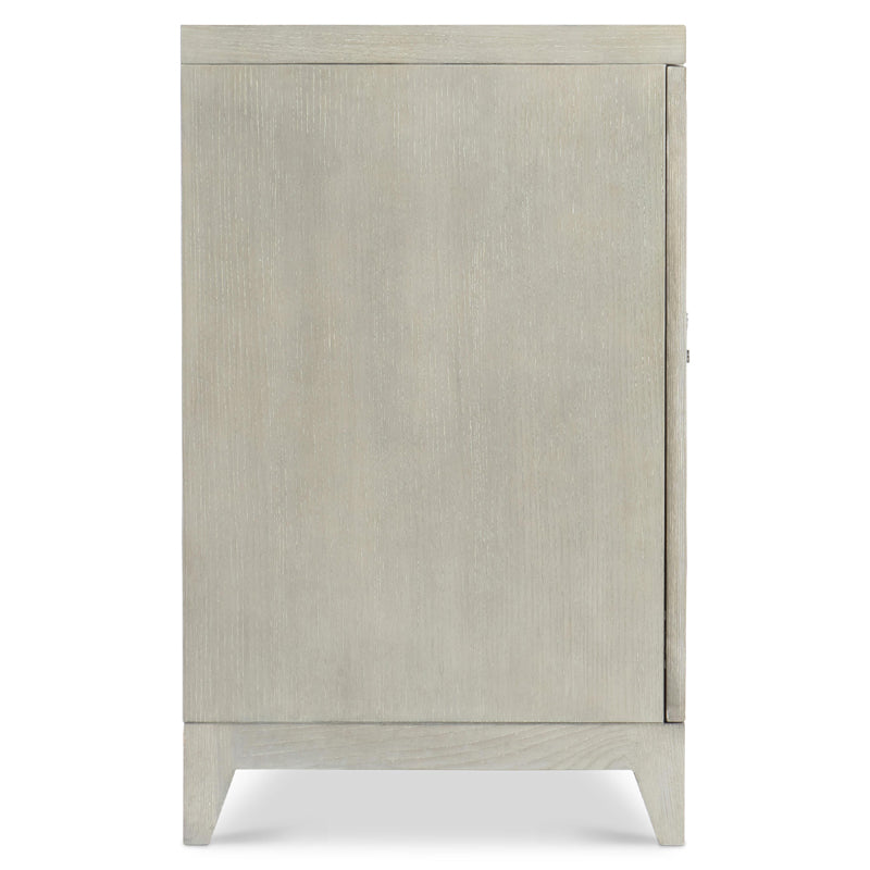 Ash wood in Nebbia finish with metal accents in Brushed Stainless Steel finish and door pulls in Glazed Stainless Steel finish