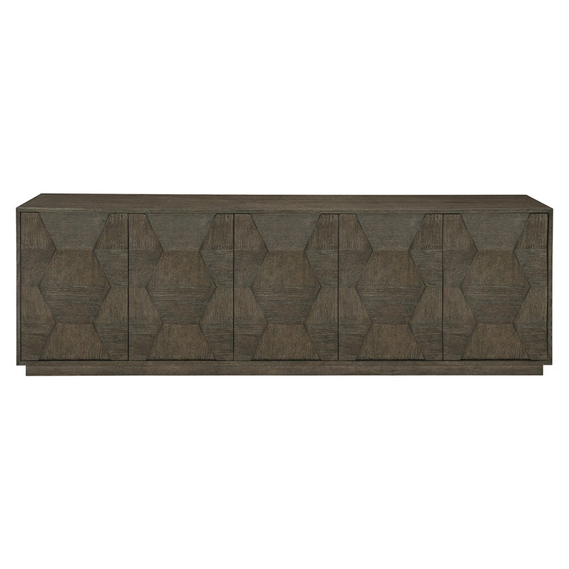 A rustic modern entertainment console distinguished by its wire-brushed, cerused oak veneers in a faceted design.