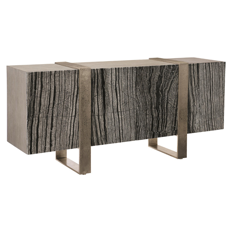 Heavily textured metal and boldly striated Black Forest marble add layers of sophistication to this dramatic entertainment console.