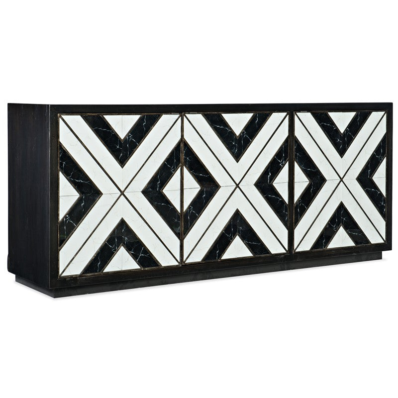 With an intriguing matrix design, the Noir Et Blanc Entertainment Console is a dramatic and striking focal point to punch up any interior. The exquisite door fronts have reverse handpainted glass designed to look like marble. The case is finished in Noir, a black paint with rich brown undertones, and the antique silver colored tab pulls add a luxurious touch. The 3 doors have soft close hinges, and there is one adjustable shelf behind the left pair of doors and one adjustable shelf behind the right door. Crafted of Poplar and Hardwood Solids with Oak Veneers and Glass, there is a ventilated back panel and 3 electrical outlets included. Accommodates up to an 80-inch TV.