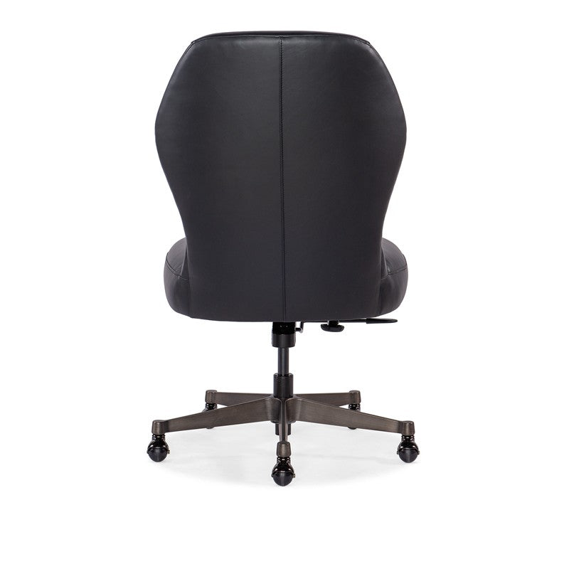 With a sleek armless profile, the adjustable-height Executive Swivel Tilt chair is offered in a contemporary style, highlighted by the Bali Charcoal leather cover and correlating gunmetal base for a monochromatic look. On casters.