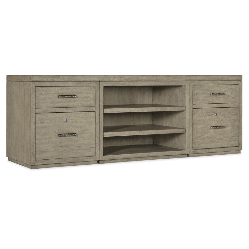 With a rustic weathered smoked gray Mink finish and clean modern lines, the Linville Falls Credenza includes an 84-inch top and two files on each end with an open cabinet with two adjustable shelves in the center. The credenza features a total of 4 drawers, including two top utility drawers and lower locking file drawers with pendaflex filing system. Fully finished on the back, the credenza can be floated in a room.