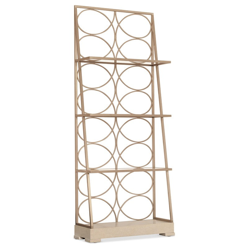 Transform your home office or living space with the Flourish Etagere from the Melange collection. This transitional bookcase features the Polished Limestone finish on oak veneers, an open geometric circle motif, and an angled frame for a modern aesthetic. With three metal-framed glass shelves and a sturdy wood base, it’s perfect for displaying books, decor, or collectibles. The open back and side design create an airy feel, making it an excellent choice as a decorative room divider.