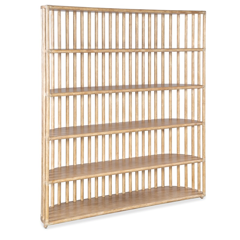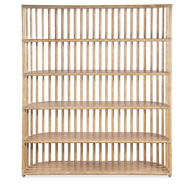 Tranquil with a modern twist and clean lines, the Retreat Slatted Bookcase defines and declutters your space. Featuring four fixed shelves, a slatted back and curved sides, it has rope accents. Finished on all sides so it can float in a room, it is crafted of Oak Veneers in the Dune sand-colored finish, transparent by design to showcase the unique wood grain patterns. The Dune finish is inspired by light sand and the smooth shore after a receding tide.