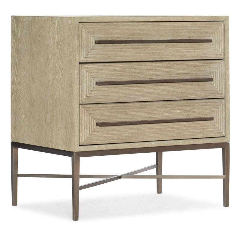 Svelte and sophisticated in a serene soft finish on Oak Veneers with tactile reeded drawer fronts, the Cascade Nightstand with 3 self-closing drawers is a stylish statement piece brimming with storage and function. The Terrain finish on oak veneers is dry-brushed for a casual appeal, and accented by champagne-colored bar pull hardware and slender metal legs joined by an X-stretcher. Functional features include a USB Outlet and cord clip.