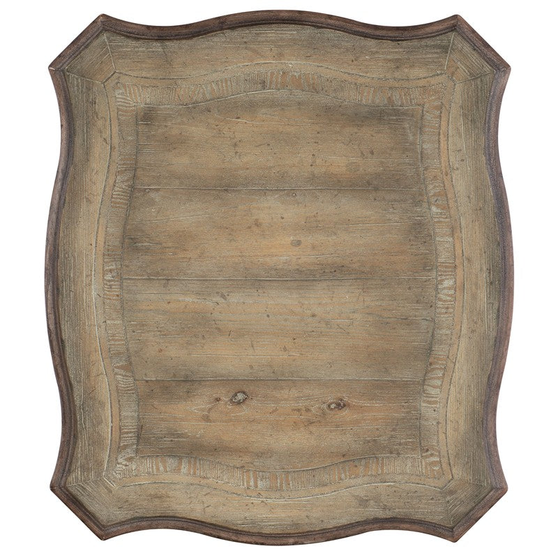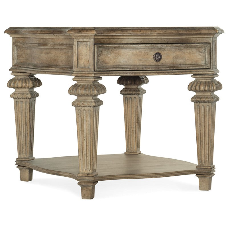 Old World charm and classic design elements like shaped and fluted legs are updated with a relaxed rustic finish with the look of natural wood bathed in sunshine in the Castella End Table. Crafted of Pecan, Quartered Walnut, Black Walnut, Ash and Maple Veneers, the table exudes a livable resort feeling. One drawer and one fixed shelf.