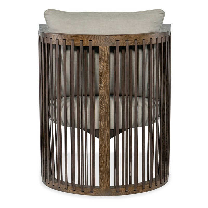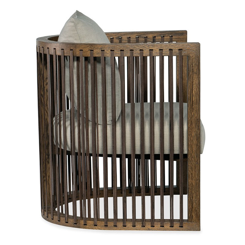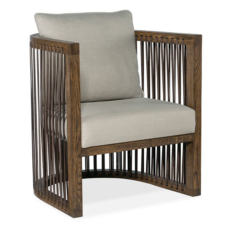 Modern, sophisticated and organic, the Wilde Club Chair has a distinct U-shaped frame in a warm brown oak finish with top-grain leather strapping all the way around. There’s a tight seat and loose pillow back upholstered in Samantha Taupe, a linen blend.