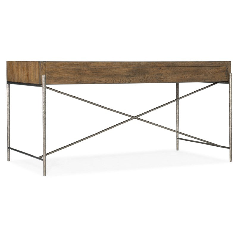 With exquisite scale and craftsmanship, the Chapman Writing Desk is crafted of White Oak Veneers in a warm brown Sorrel finish with thin forged pewter metal legs, an X-stretcher back and custom hand-hammered metal drawer pulls. Featuring 3 drawers, the left and right drawers have 2 removable dividers, and the center drawer has a drop-front for keyboard use and a cutout in the back of the drawer for wire management. There’s a pencil tray and writing slide for use in either left or right drawer.