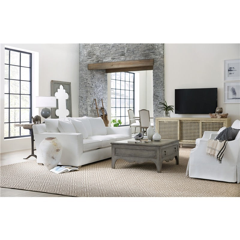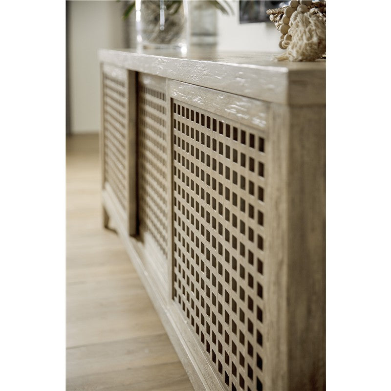 With a romantic French laundry and Shabby Chic appeal, the Ciao Bella Entertainment Console will star in your family room with its Flaky White finish with hand wire brushing over light and airy perforated doors. Crafted of Poplar and Hardwood Solids with Maple Veneers, the console has 3 sliding doors with one adjustable shelf behind each door, a ventilated back panel, 3-plug outlet and accommodates up to an 80- inch TV.