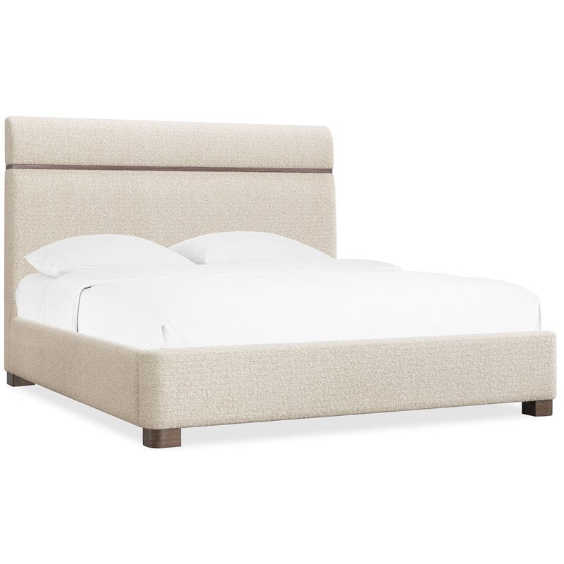 Experience luxurious comfort with the Eleana Upholstered California King Panel Bed, blending fabric upholstery with Light Caramel walnut veneer trim. Its spacious California King size and modern, clean lines make it a perfect addition for transitional interiors.