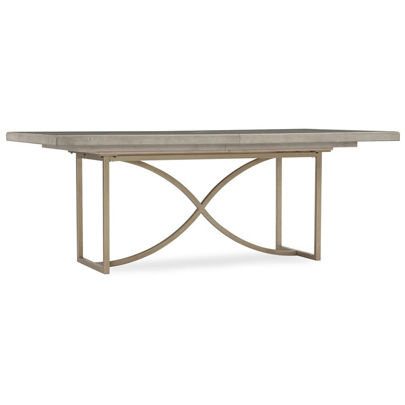Gather the family around a fashion focal point with the soft modern Elixir Rectangular Dining Table, crafted of wood solids and Walnut veneers. The soft-brushed brass base in a stylish X-motif is topped with a herringbone pattern veneer table surface. With leaf, table extends to over 8 feet wide and comfortably seats 8.