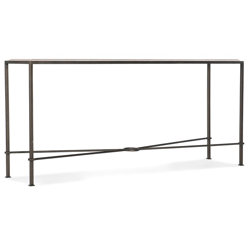 In a light-and-airy style that’s a breath of fresh air, this distinctive console table has a dark charcoal textured metal frame, base and X-stretcher and a creamy beige marble top in a blend of neutrals to fit in a wide range of interiors. The convenient narrow rectangle shape is only 16 inches deep, making it the perfect choice for smaller spaces.